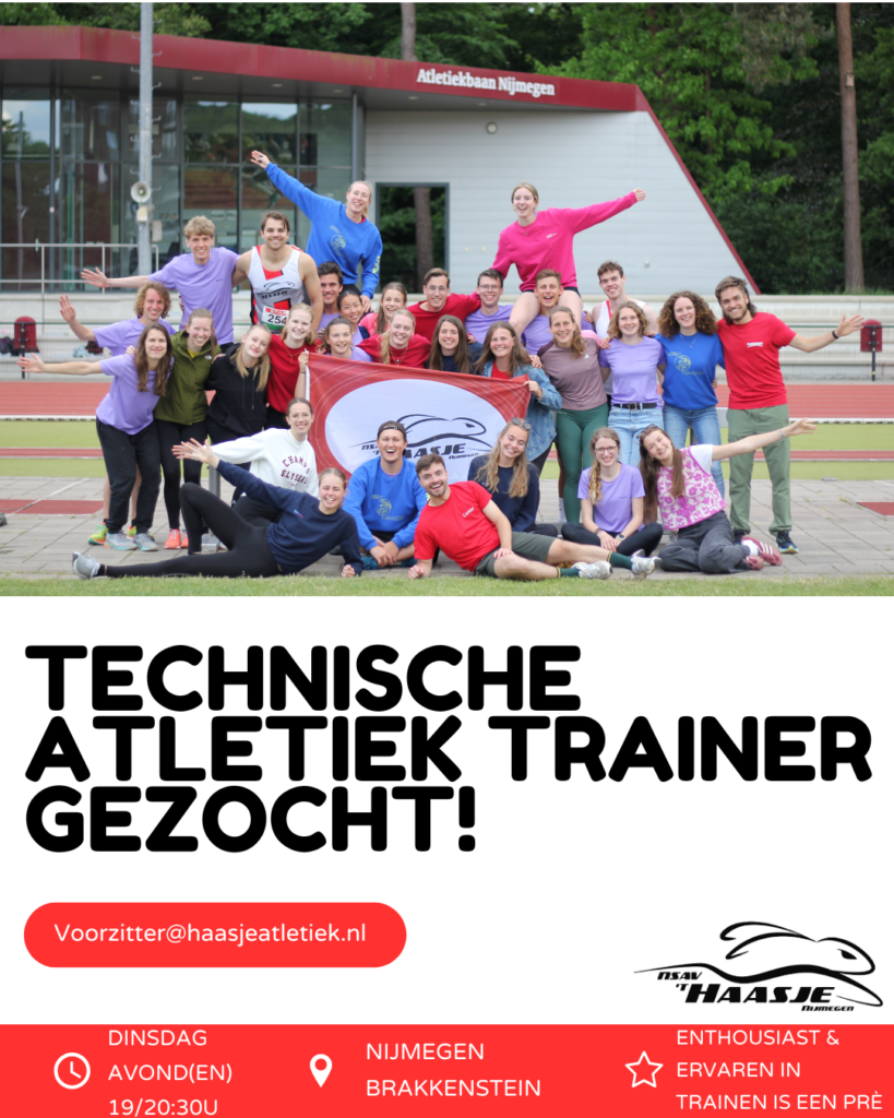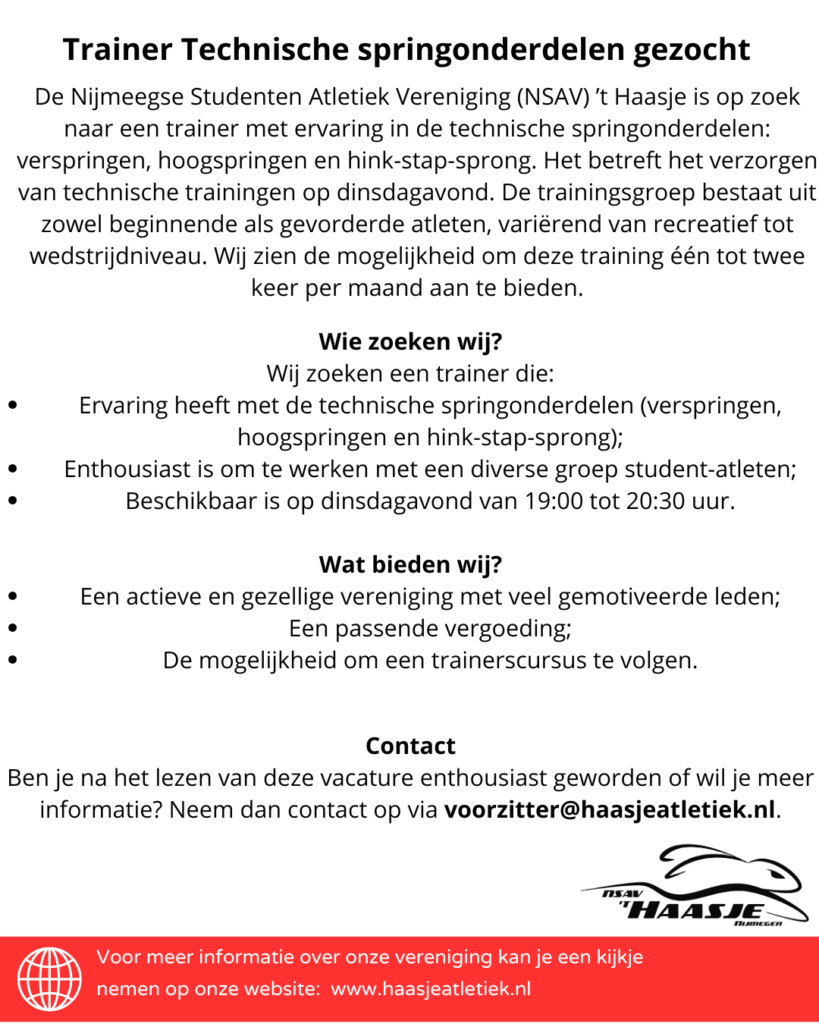Vacatures Momenteel zijn we opzoek naar een nieuwe technische trainer! Zie de vacature hieronder voor meer informatie. Bij vragen of behoefte aan meer informatie mag er altijd contact worden opgenomen met voorzitter@haasjeatletiek.nl